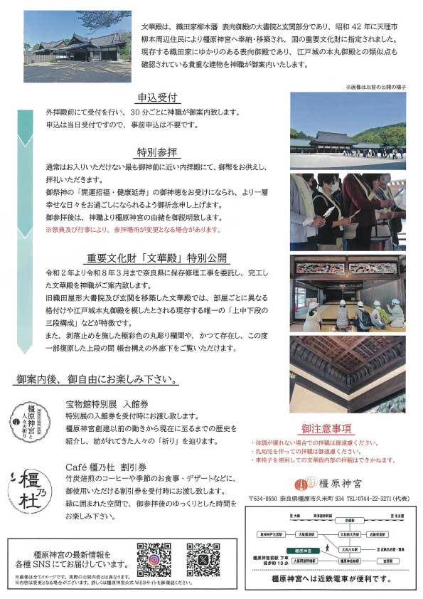 | 開催名 | 橿原神宮特別参拝と文華殿特別公開 https://kashiharajingu.or.jp/news/13870.html |