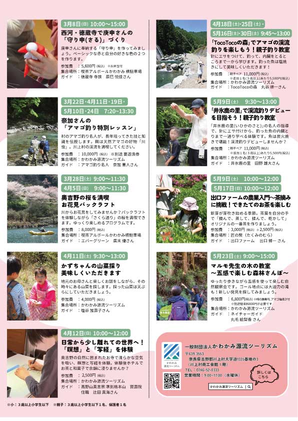 | ■「TocoTocoの森」でアマゴの渓流釣りを楽しもう!親子釣り教室 4/18(土)、5/16(土)、5/30(土) ■丹生川上神社三社巡り と 特別企画上社夜間正式参拝ツアー1泊2日 4/18(土)、5/23(土)出発 ■奈加さんの「アマゴ釣り特別レッスン」 3/22(日)、4/11(土)、4/19(日)、5/10(日)、5/24(日) ■普段は立ち入ることのできない秘められた源流へ 水源地の森ツアー1泊2日 5/9(土)出発 ■『かずちゃん』の山菜採り 美味しくいただきま~す! 4/11(土)、4/26(日) ■「井氷鹿の里」で渓流釣りデビューを目指そう!親子釣り教室 5/9(土) ■出口ファームの農業入門~茶摘みに挑戦!できたてのお茶を楽しむ~ 5/9(土)、5/17(日) ■マルモ先生の木の教室 五感で楽しむ森林さんぽ 5/23(土) |