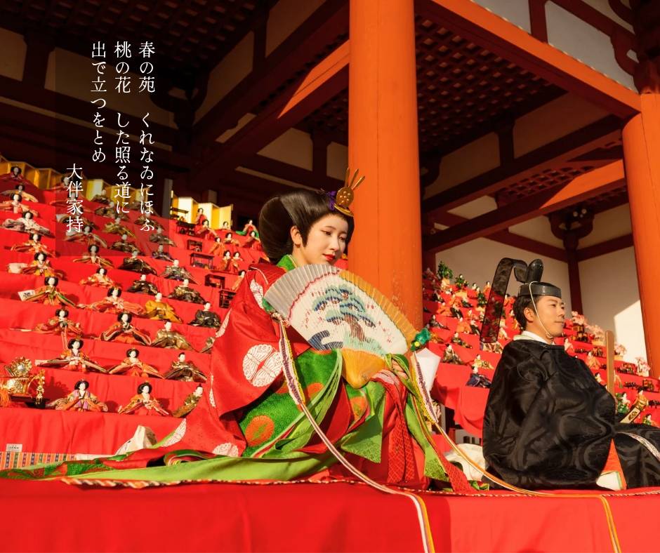 平城宮跡歴史公園・朱雀門前に設置される大雛壇飾りを中心に、園内全施設を使用して古式雛から変わり雛まで多種多様な雛人形が展示されます。