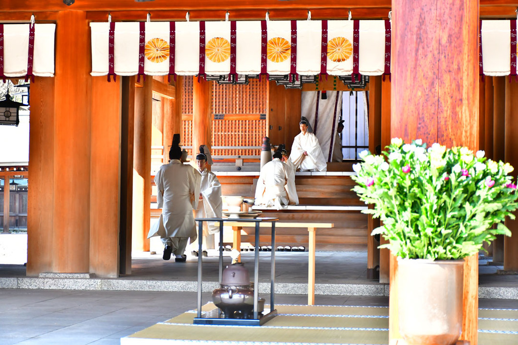 初代天皇である神武天皇が、畝傍山の東南・橿原の地で即位されたという『日本書紀』の記述に基づき、1890年に橿原宮址に創建されました。檜皮葺の本殿と神楽殿や広大(約16万坪)な杜が、荘厳な雰囲気を醸しだしています。