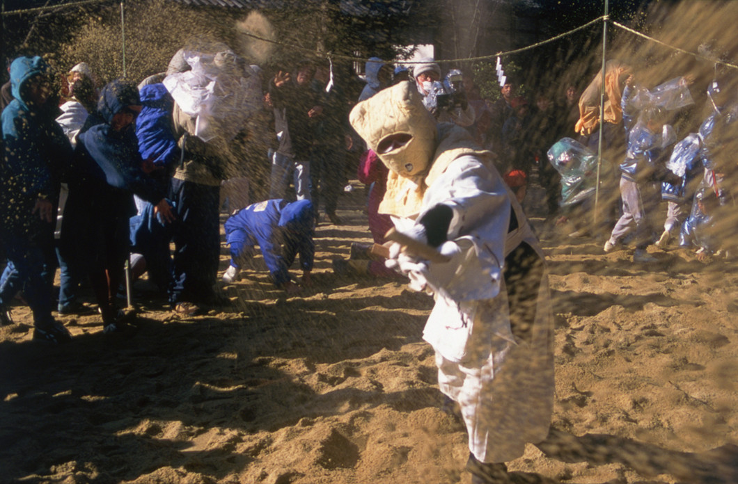庭上の儀には、砂を盛んにかけ合うほど、田植えの時期に雨がよく降り、豊作になるとされ、奇祭として有名です。
