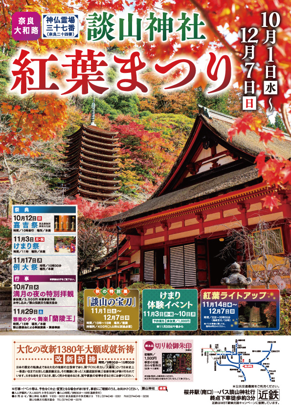 開催名 | 紅葉まつり https://tanzan.or.jp/info/jinja_news/%E8%AB%87%E5%B1%B1%E7%A5%9E%E7%A4%BE%e3%80%80%E7%B4%85%E8%91%89%E3%81%BE%E3%81%A4%E3%82%8A/ |