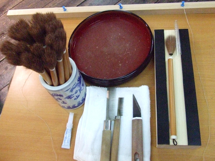 A:筆の穂先に糊を浸み込ませて形成する仕上げ体験。