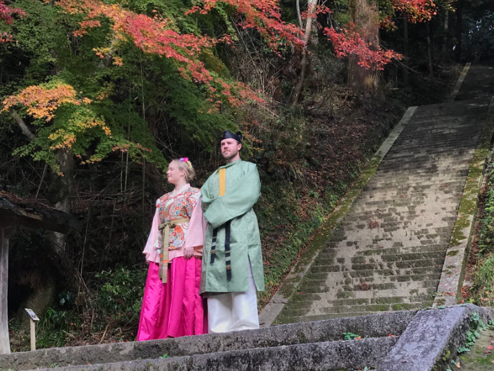 古代衣装を身に着けて、記念撮影や飛鳥の遺跡めぐりを楽しむタイムトリップ体験。