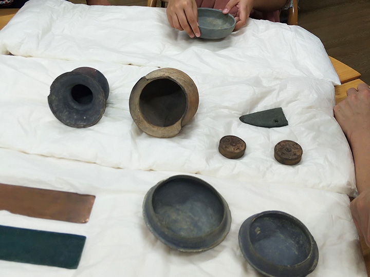 遺物に触れ、パズルなどの教材で考古学を楽しむ体験も。