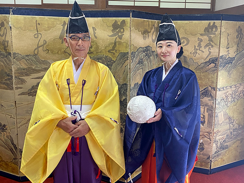 本物のけまり装束を身に着けて、本物の鞠をける体験。