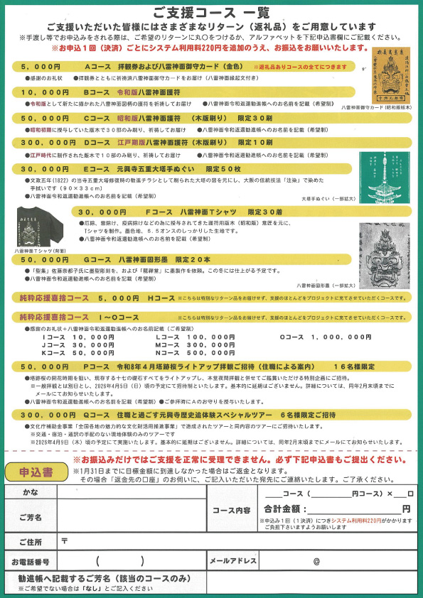 奈良時代や中世以降の信仰を復活させ、寺院活動を復興させるための第一弾プロジェクトとして、「八雷神面」を当寺にお戻しするクラウドファンディングを実施いたします。ご支援いただいた浄財は、八雷神面を安置するための本堂改修や、セキュリティ対策、参拝者のための環境整備に充てさせていただきます。